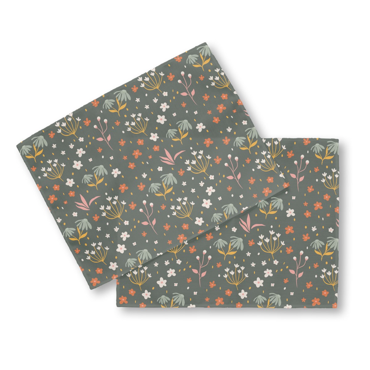 A seamless floral pattern on a dark green background features stylized wildflowers and leaves. The charming, whimsical design uses an earthy color palette of muted orange, white, sage green, pink, and mustard yellow, evoking a folk-art or vintage feel suitable for textiles.