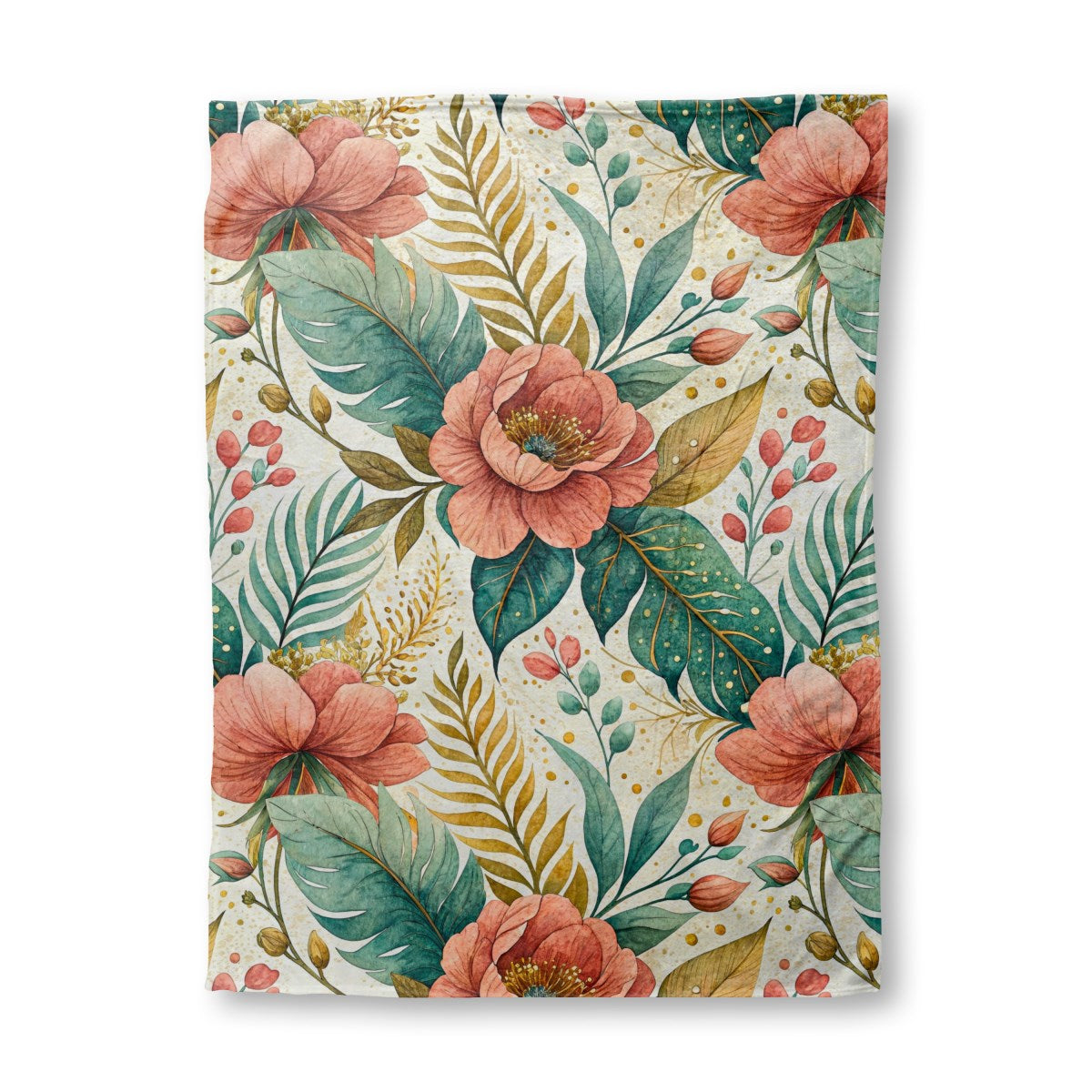 A watercolor-style botanical pattern featuring large, dusty rose flowers and lush tropical leaves in shades of teal, green, and gold. The elegant design is set on a cream background accented with golden speckles, creating a warm and artistic feel.