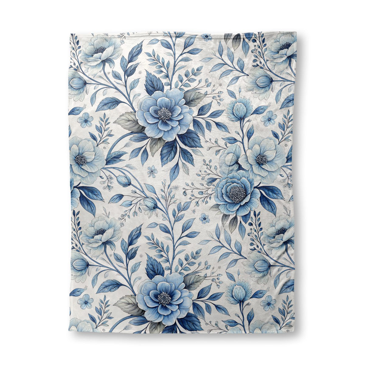 This image displays a seamless floral pattern with elegant, watercolor-style illustrations. Various blue flowers, from light to deep indigo, are intertwined with matching leaves and stems on a clean white background, creating a classic and delicate botanical design.