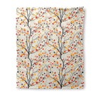 A whimsical, stylized illustration of a tree with dark, slender branches. It is adorned with round, colorful leaves or berries in warm autumnal hues of red, orange, and yellow against a light, speckled background, evoking a watercolor-style aesthetic.