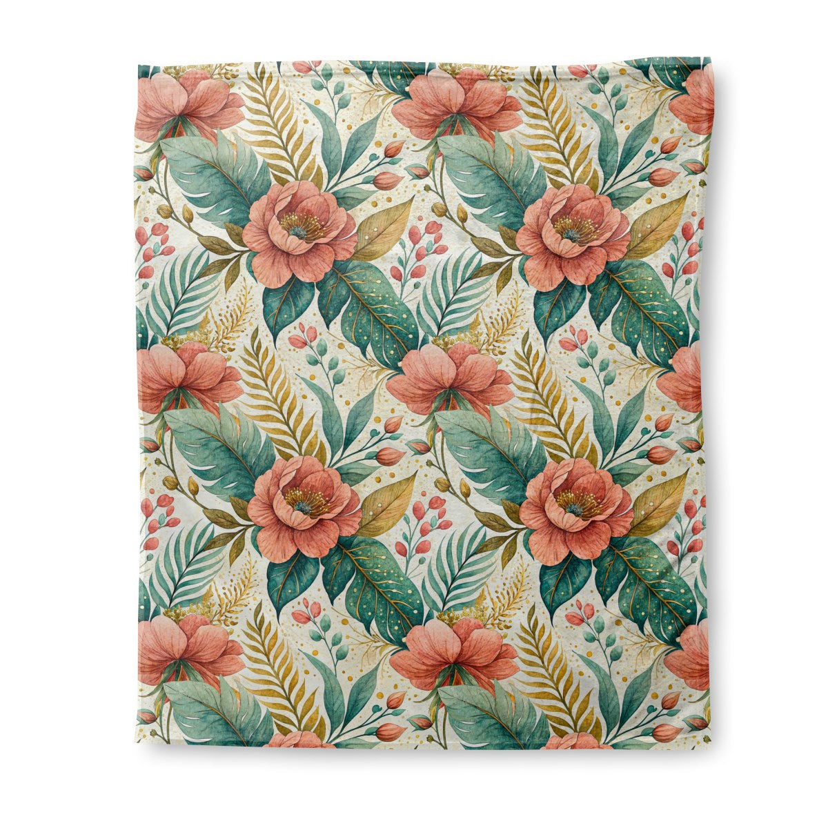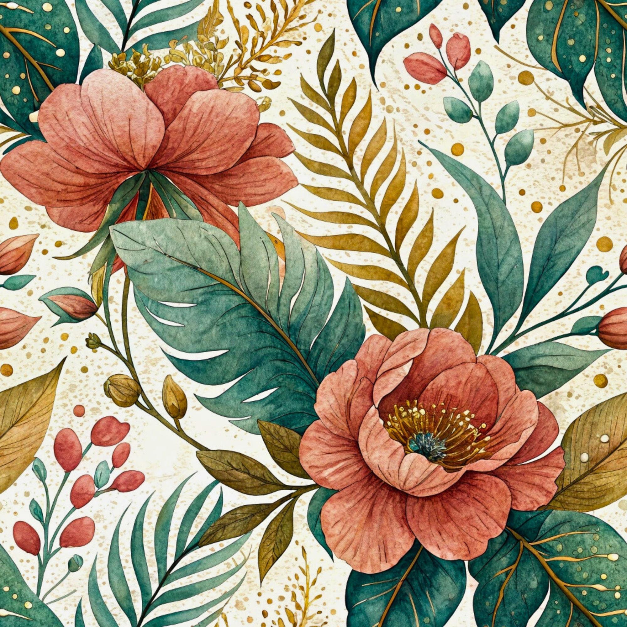 A watercolor-style botanical pattern featuring large, dusty rose flowers and lush tropical leaves in shades of teal, green, and gold. The elegant design is set on a cream background accented with golden speckles, creating a warm and artistic feel.
