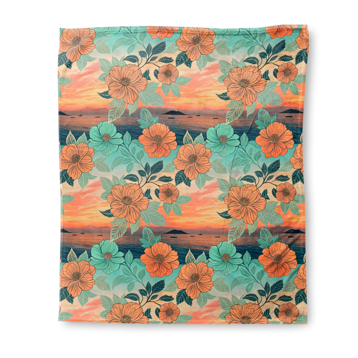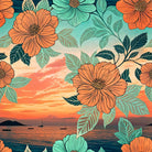 This composite image blends a stylized floral pattern with a realistic ocean sunset. Bold orange and turquoise flowers are overlaid on a serene seascape featuring sailboats and distant islands under a vibrant, cloudy sky, creating a unique artistic collage.