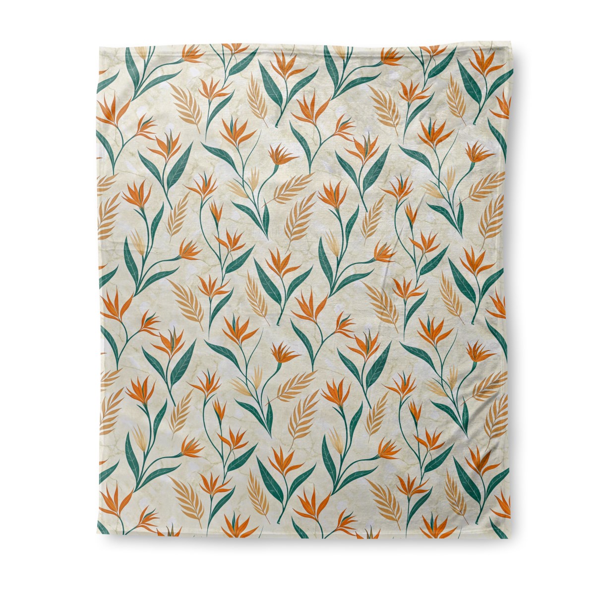 This image displays a seamless botanical pattern featuring stylized Bird of Paradise flowers. The orange, tan, and dark green plants are set against a light, creamy background with a subtle marbled texture, creating an elegant and modern tropical design.