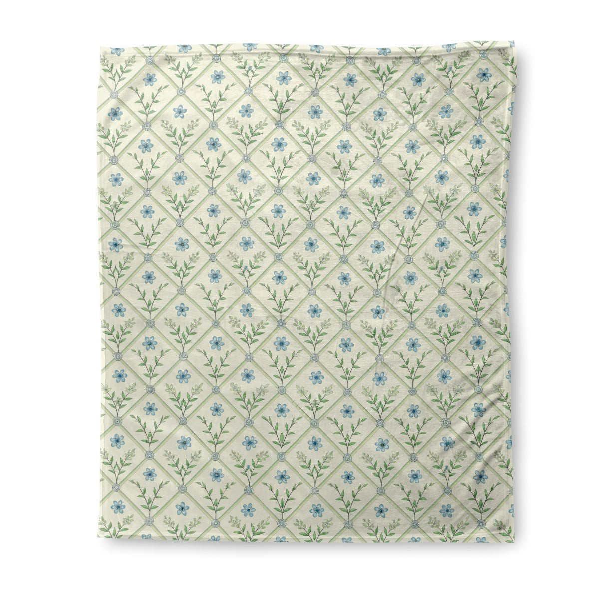 A seamless botanical pattern featuring a light green diagonal trellis on a cream background. The diamond shapes contain alternating motifs of a single blue flower and a leafy green sprig, creating a delicate, vintage-inspired design suitable for wallpaper or fabric.