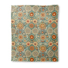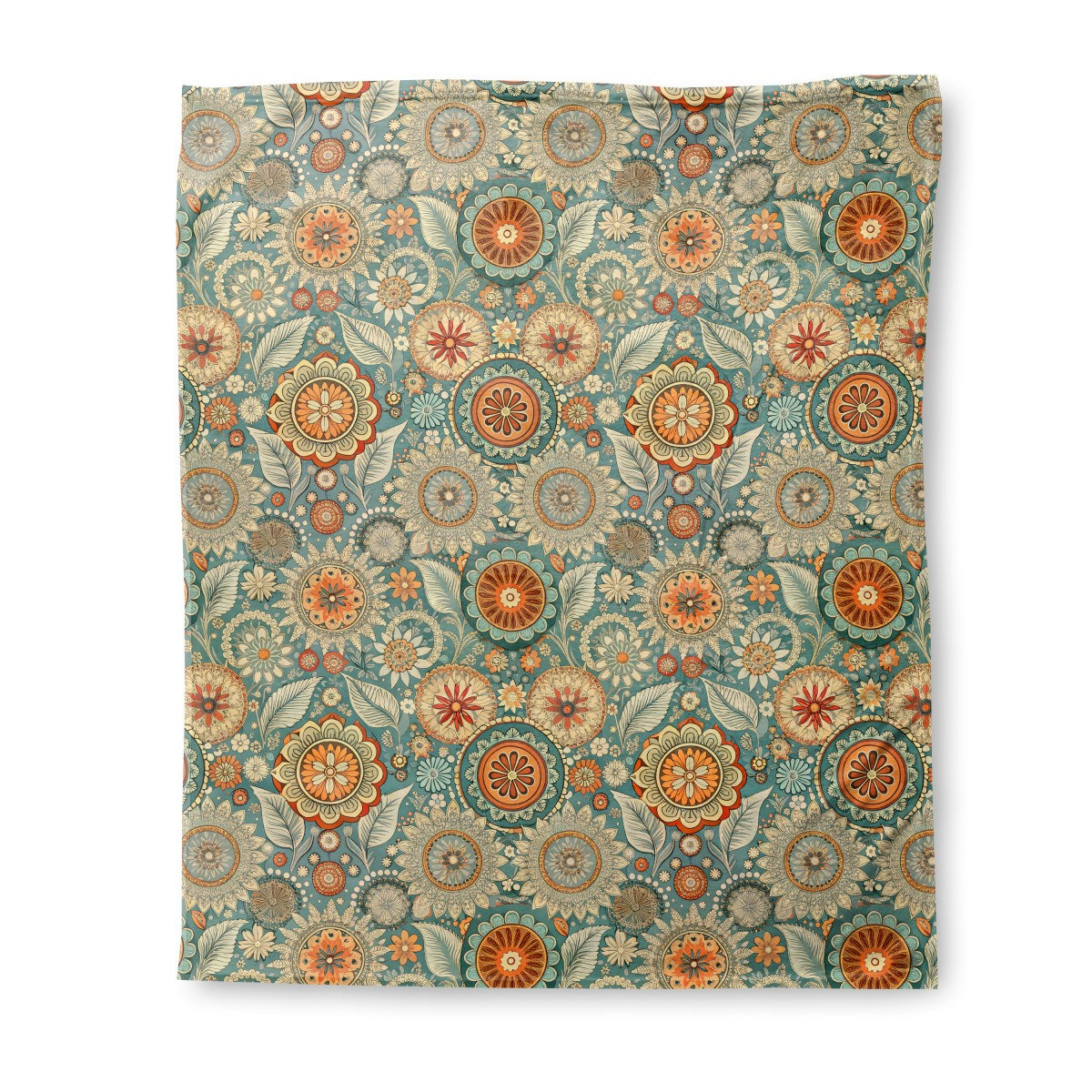 A vibrant, bohemian-style floral pattern featuring intricate, mandala-like flowers and stylized leaves. The rich color palette of teal, orange, and cream creates a warm, retro aesthetic on a dense, folk-art-inspired background.