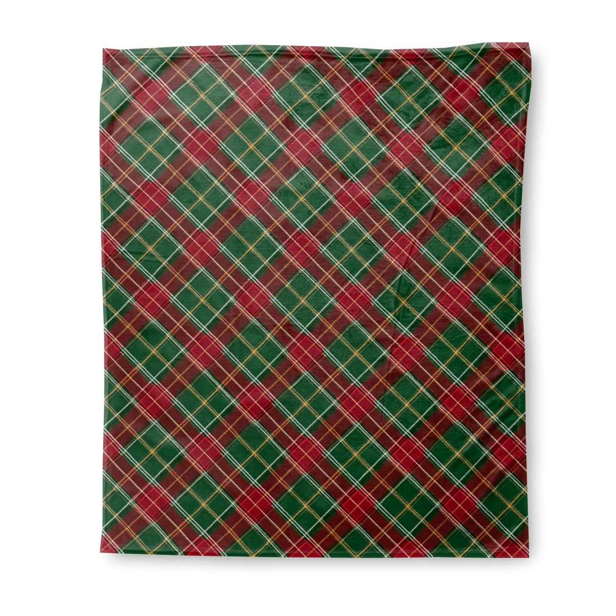 This image features a classic Christmas plaid pattern. The diagonal tartan design consists of intersecting stripes in festive colors of red, green, white, and gold. The pattern has a slightly woven texture, evoking a traditional and cozy holiday feel.