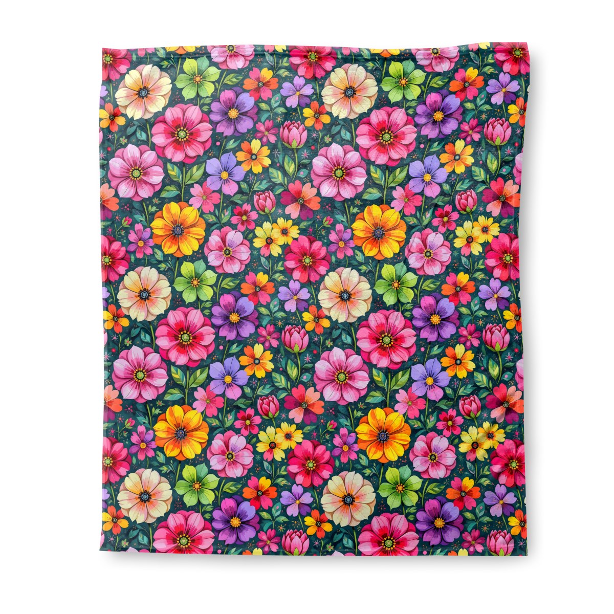 A vibrant, stylized floral pattern featuring a dense arrangement of multicolored flowers. Bright pinks, purples, oranges, and yellows pop against a dark teal background, creating a cheerful and energetic composition.