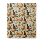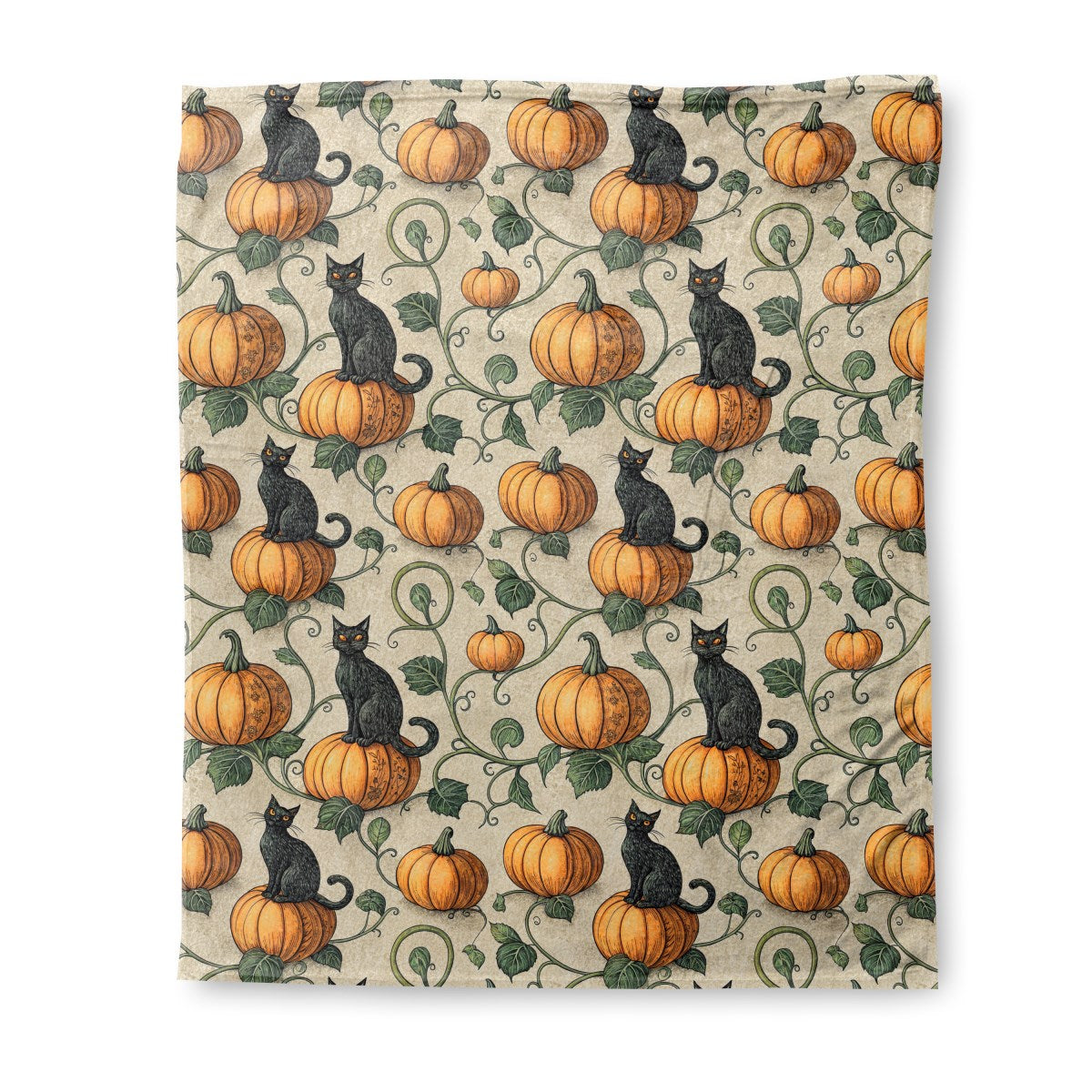 A vintage-style seamless pattern features black cats with glowing orange eyes perched on pumpkins. Swirling green vines and leaves connect the elements on a textured, light background, creating a classic Halloween-themed illustration with a slightly spooky feel.