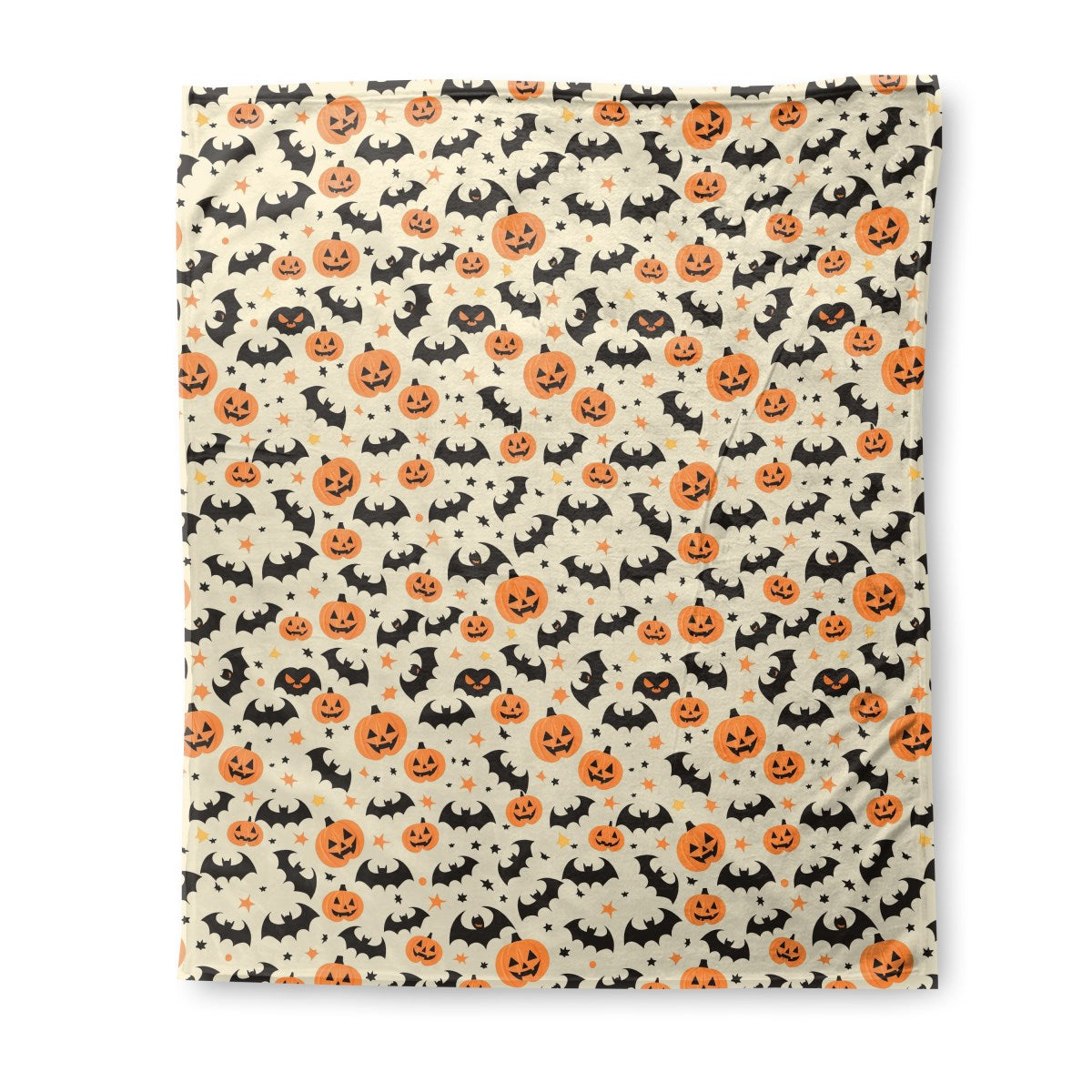 A cheerful, seamless Halloween pattern featuring smiling jack-o'-lanterns, black bat silhouettes, and small stars. The festive cartoon design is set against a light cream-colored background, creating a fun and spooky theme.