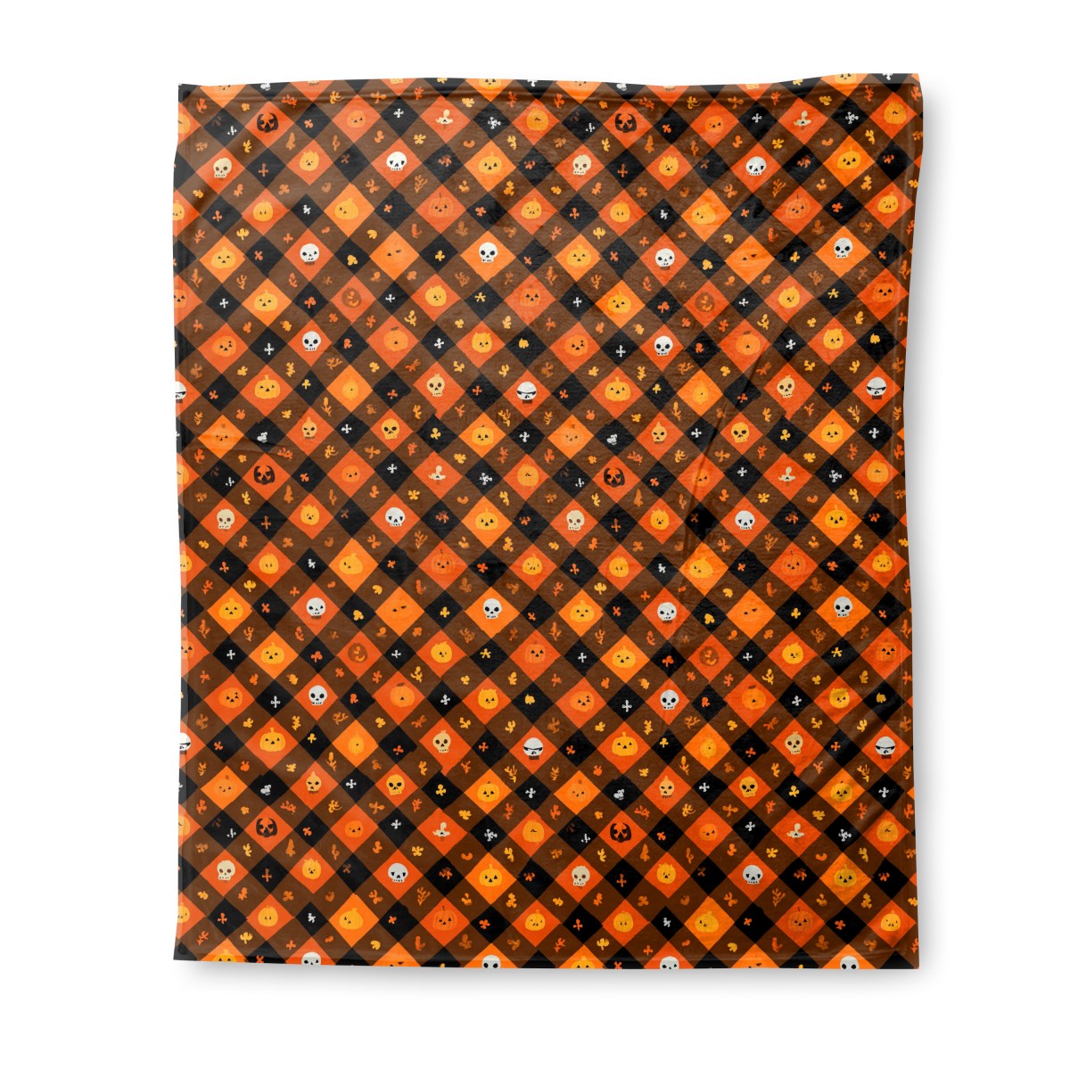 A whimsical, seamless Halloween pattern featuring a diagonal plaid in orange, black, and brown. The design is scattered with hand-drawn, cartoonish skulls, jack-o'-lanterns, and other small autumnal motifs, creating a festive and spooky-cute feel.