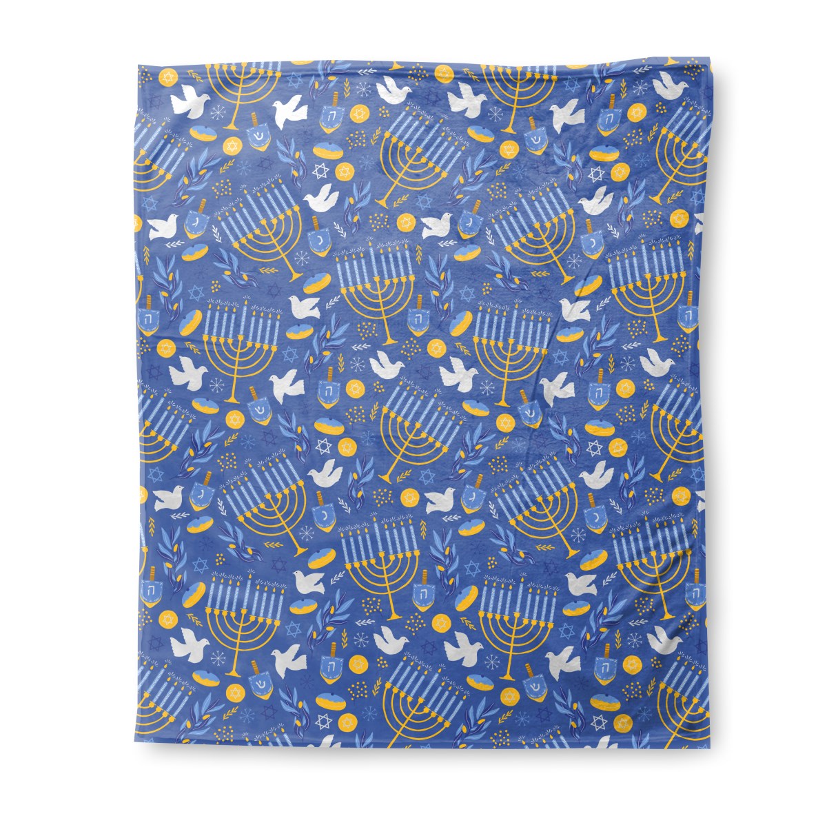 A festive, repeating pattern celebrating Hanukkah on a blue background. The design features illustrations of menorahs, dreidels, sufganiyot (doughnuts), Stars of David, and white doves in a cheerful yellow, blue, and white color palette, creating a joyful holiday theme.