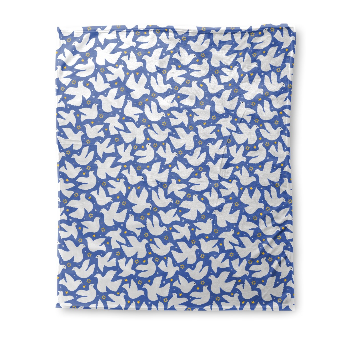 A seamless pattern of stylized white doves flying against a blue background. The design is scattered with yellow Stars of David and smaller stars, creating a symbolic and peaceful motif with Jewish themes.