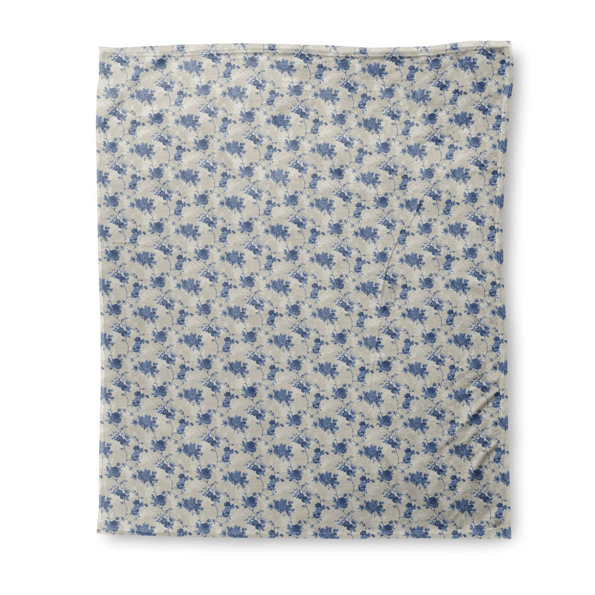 The image displays a seamless pattern of stylized blue roses on a beige background. The roses are densely clustered on thorny stems, with some buds and leaves interspersed. The background has a subtle linen-like texture. The overall style is reminiscent of classic floral toile patterns, suggesting a sophisticated and perhaps slightly traditional aesthetic.