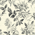 A vintage-style botanical pattern featuring detailed, monochrome illustrations of flowers and leaves. The elegant black and white drawings are layered over a cream-colored background with faint, cursive handwriting, creating a classic, romantic design.