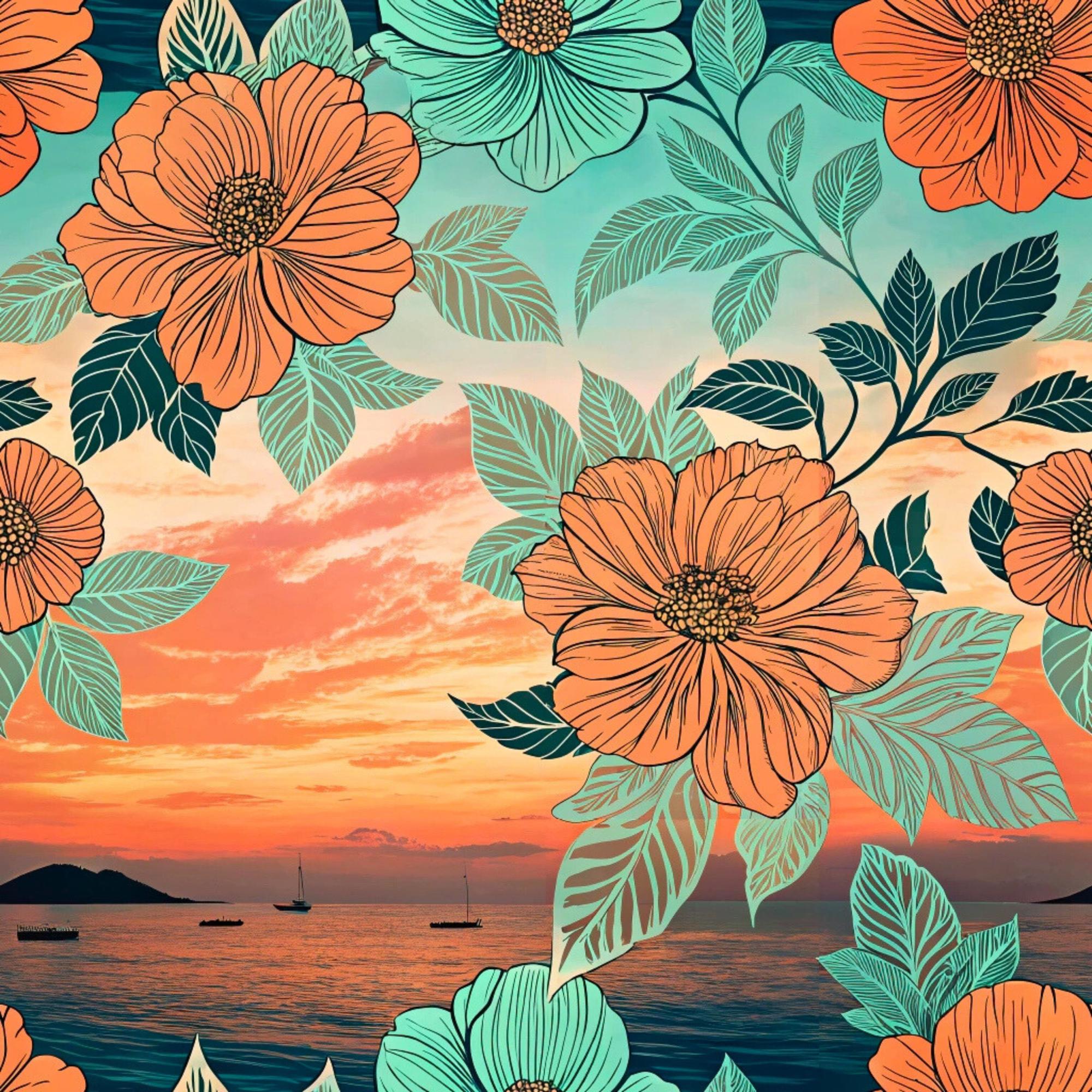 This composite image blends a stylized floral pattern with a realistic ocean sunset. Bold orange and turquoise flowers are overlaid on a serene seascape featuring sailboats and distant islands under a vibrant, cloudy sky, creating a unique artistic collage.
