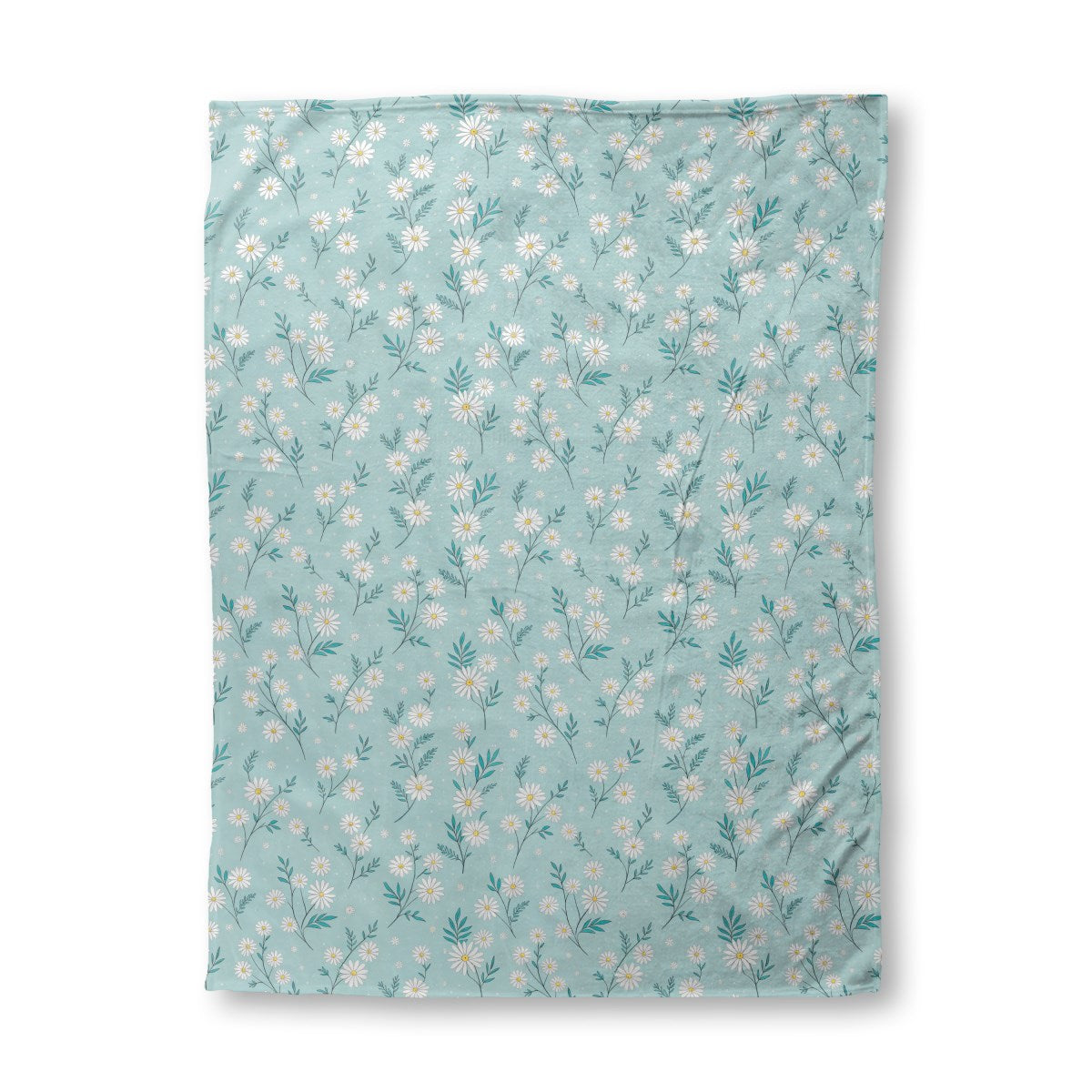 This is an illustrated, seamless pattern of delicate white daisies with yellow centers and teal leaves. The charming flowers are scattered across a speckled, light blue background, creating a fresh and whimsical design.