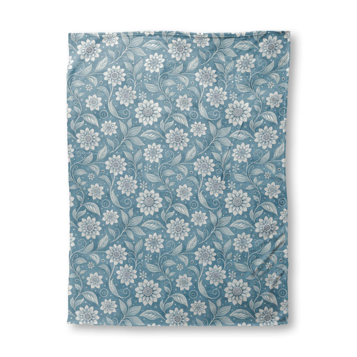 This is a seamless, monochromatic floral pattern featuring stylized white and gray flowers with swirling stems and leaves. Set against a textured, muted blue background, the elegant design has an intricate, embossed quality, giving it a vintage, decorative appearance.