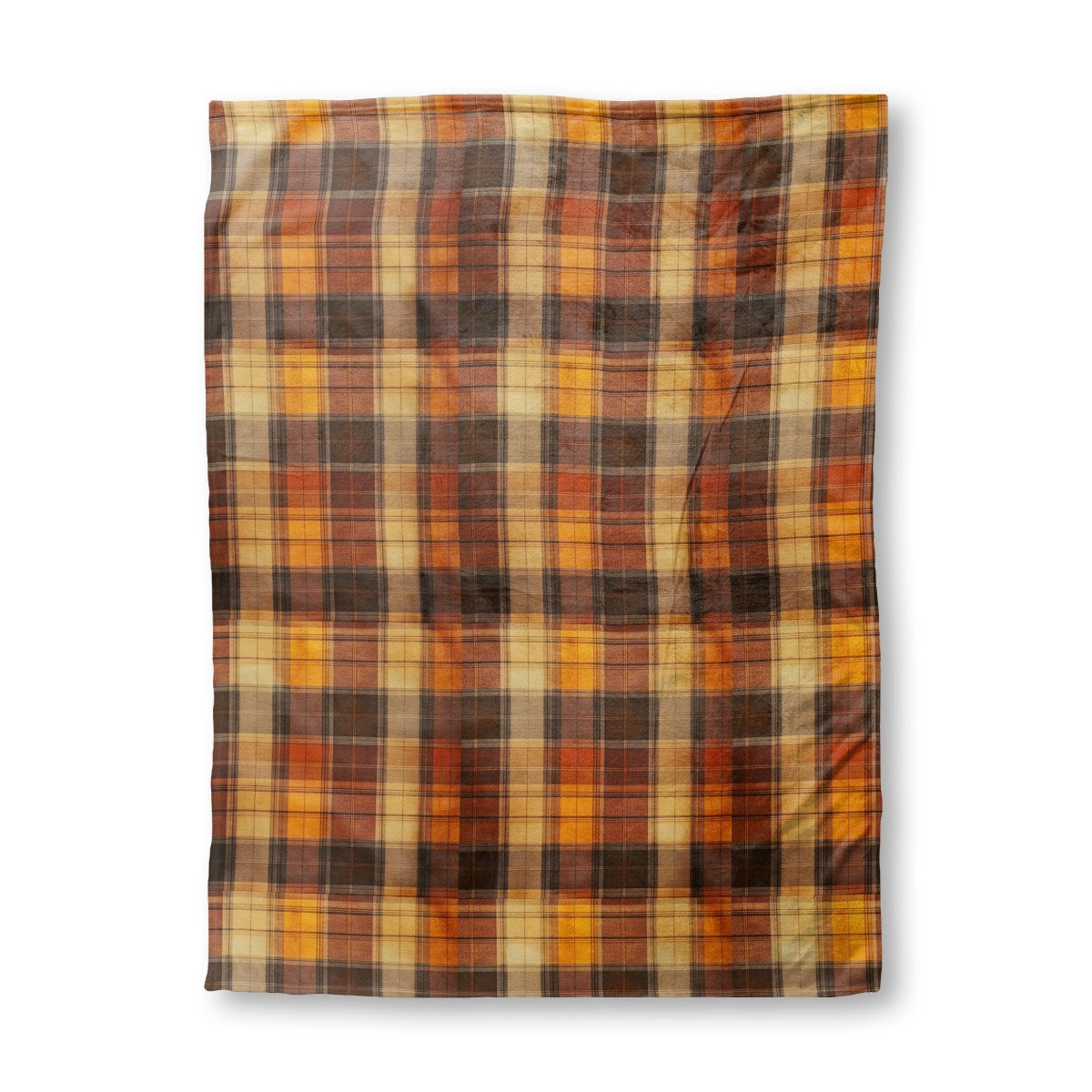 A close-up of a textured plaid fabric in a warm, autumnal color palette. The classic tartan pattern features intersecting stripes of brown, orange, mustard yellow, and beige, creating a cozy and rustic look.