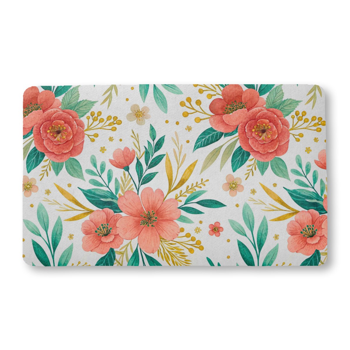 This is a vibrant watercolor floral pattern on a white background. The design features elegant coral-red flowers, teal-green and golden leaves, and delicate gold specks, creating a warm and sophisticated botanical illustration.