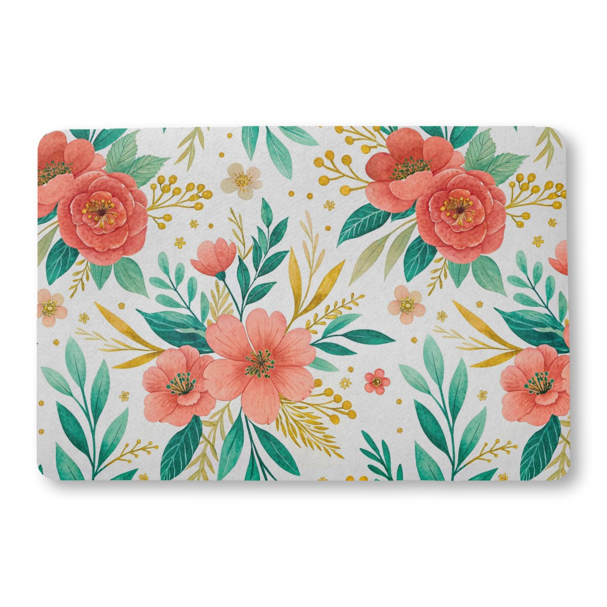 This is a vibrant watercolor floral pattern on a white background. The design features elegant coral-red flowers, teal-green and golden leaves, and delicate gold specks, creating a warm and sophisticated botanical illustration.