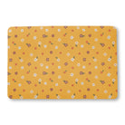 This is a seamless floral pattern featuring small, stylized flowers in white, brown, and rust-orange scattered across a solid mustard-yellow background. Some flowers have tiny green leaves, creating a warm, rustic design.