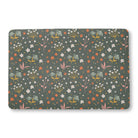 A seamless floral pattern on a dark green background features stylized wildflowers and leaves. The charming, whimsical design uses an earthy color palette of muted orange, white, sage green, pink, and mustard yellow, evoking a folk-art or vintage feel suitable for textiles.