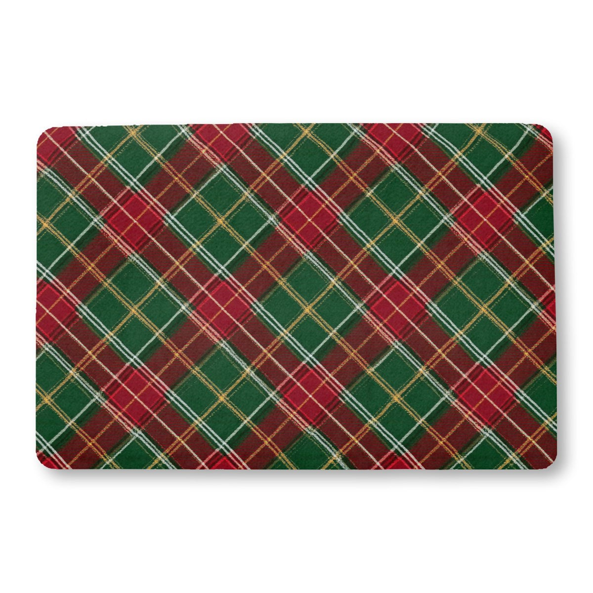 This image features a classic Christmas plaid pattern. The diagonal tartan design consists of intersecting stripes in festive colors of red, green, white, and gold. The pattern has a slightly woven texture, evoking a traditional and cozy holiday feel.