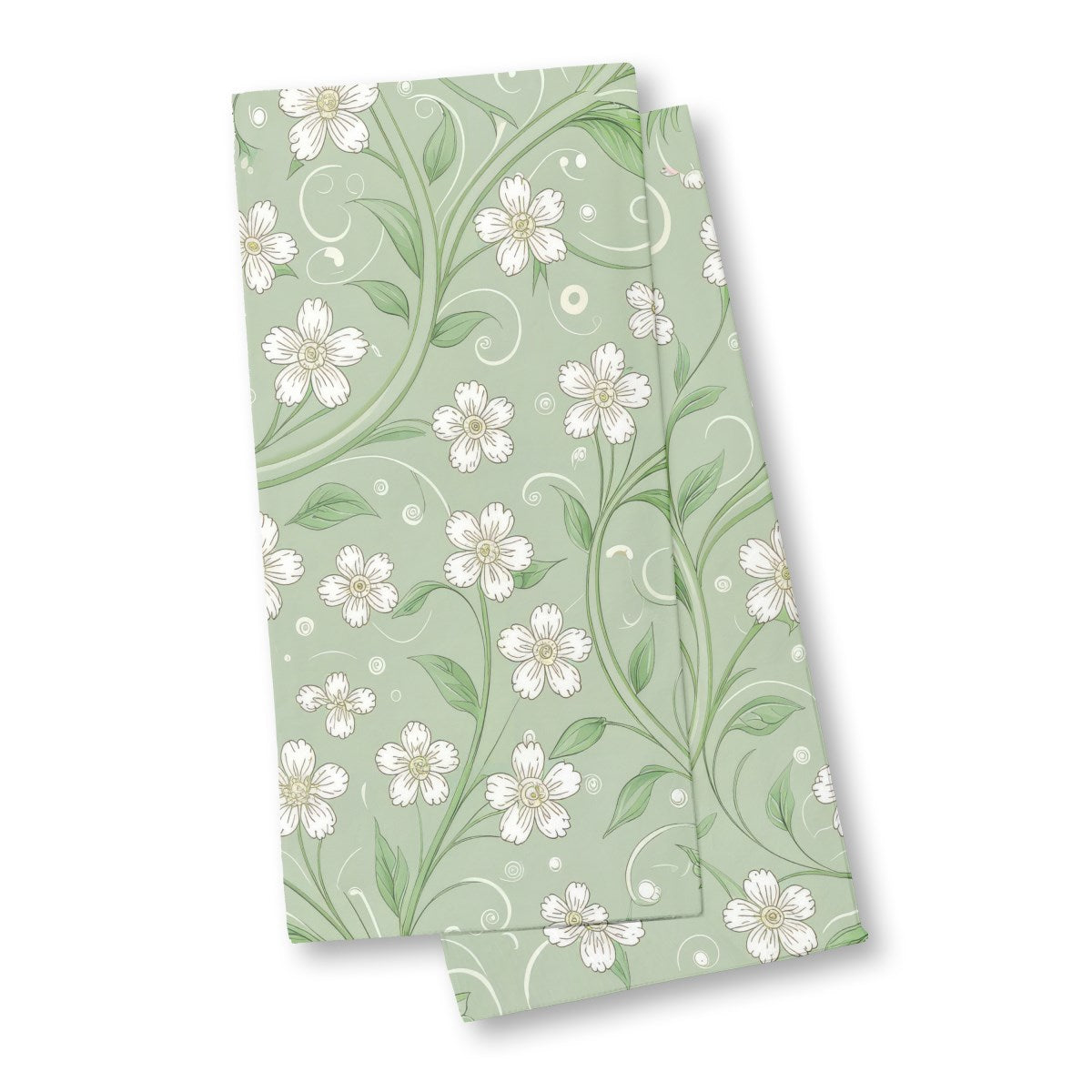 A vintage-style seamless pattern featuring delicate white flowers on gracefully swirling green vines. The intricate, elegant design is set against a soft, muted sage green background with subtle decorative swirls, creating a classic and serene composition.