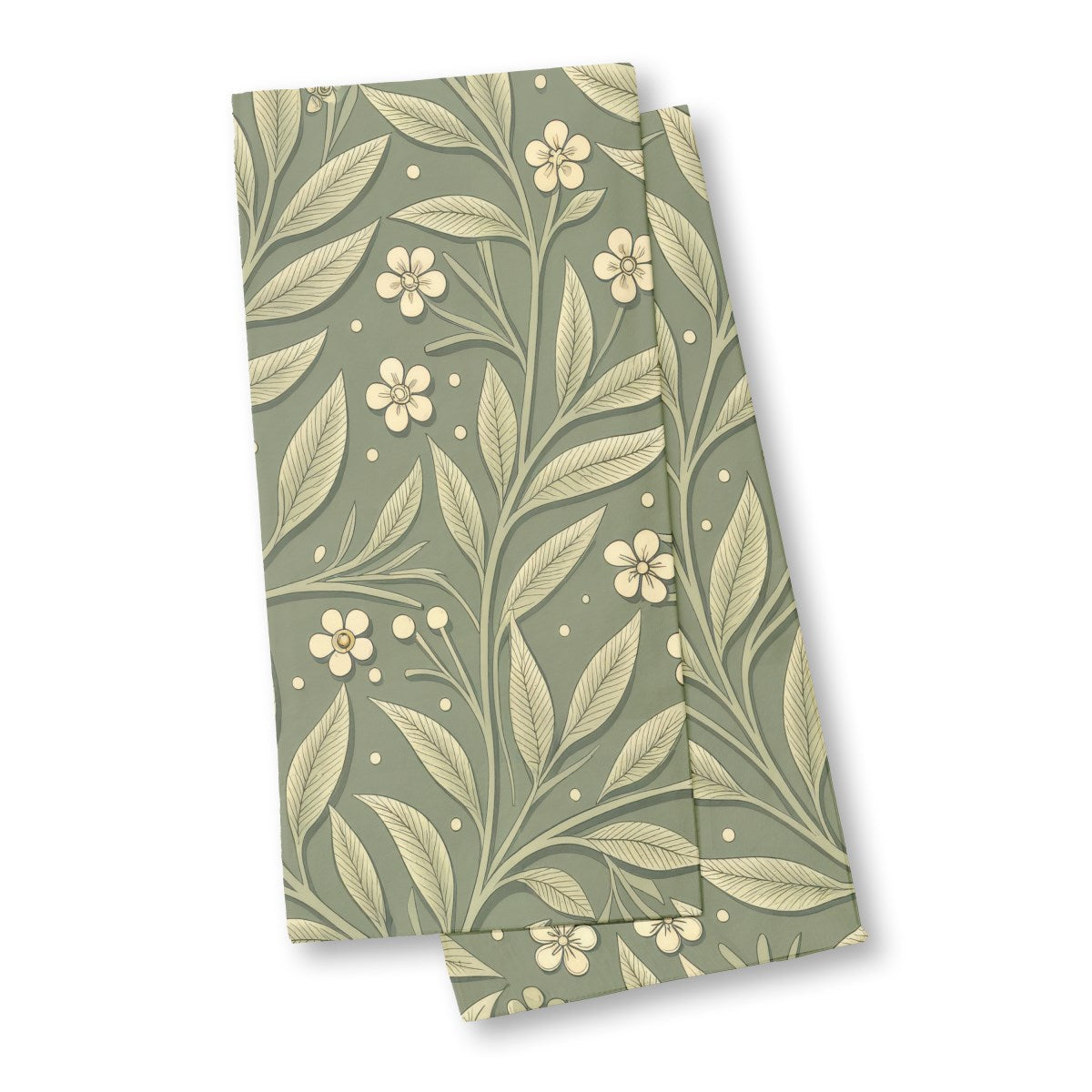 An elegant, Arts and Crafts-style botanical pattern featuring intertwining vines with veined leaves and small cream flowers. The seamless design is set against a dark sage green background, giving it a classic, embossed wallpaper appearance with a subtle three-dimensional quality.