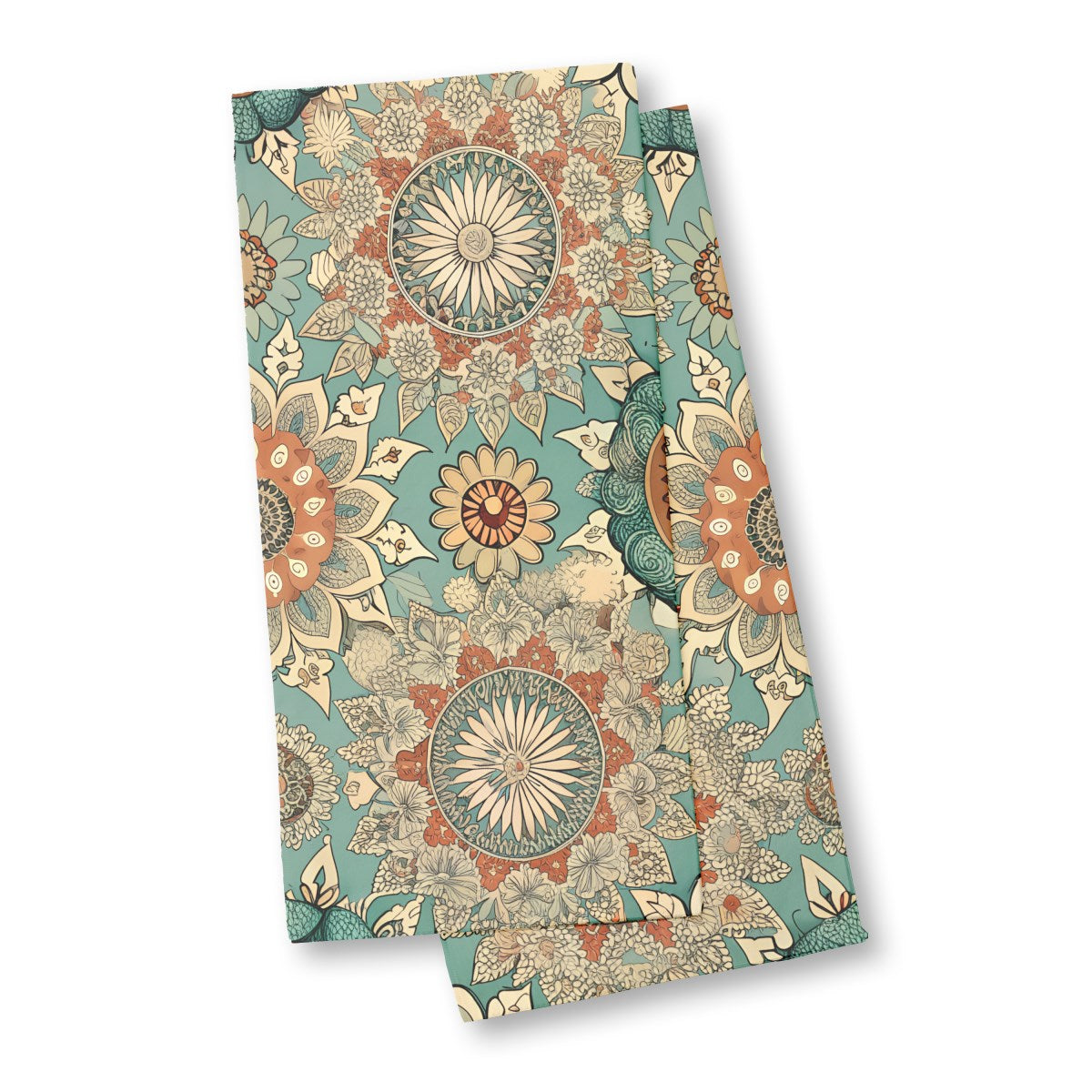 A vintage-style seamless pattern of intricate floral mandalas in a bohemian style. The design features a warm, earthy palette of orange, rust, and cream against a muted teal background, evoking the look of traditional block prints.
