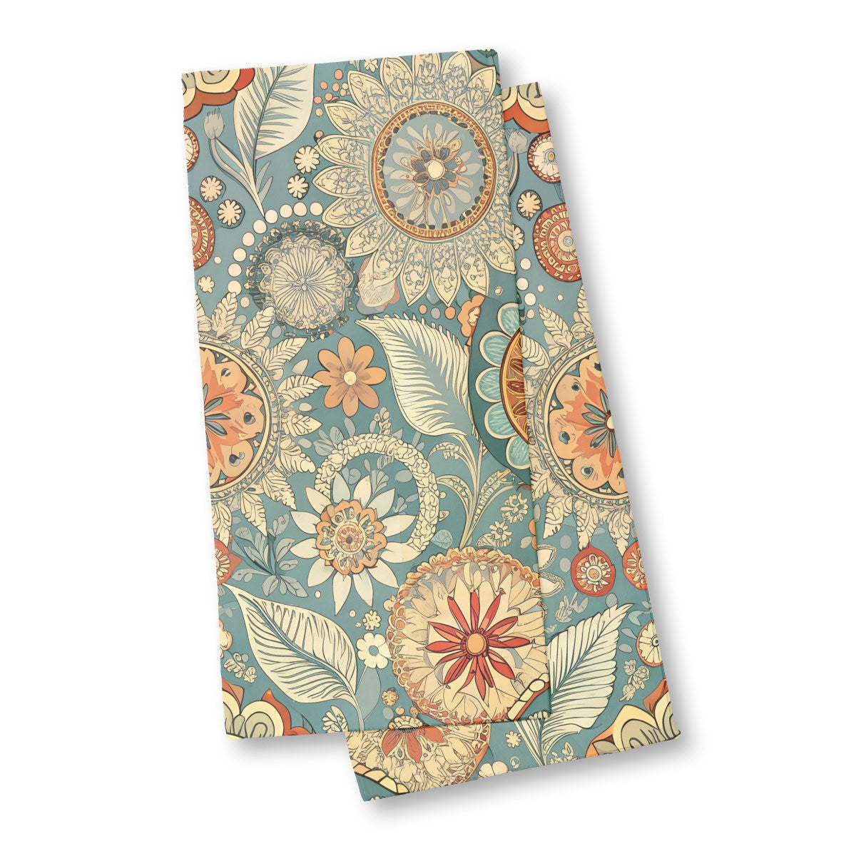 A vibrant, bohemian-style floral pattern featuring intricate, mandala-like flowers and stylized leaves. The rich color palette of teal, orange, and cream creates a warm, retro aesthetic on a dense, folk-art-inspired background.