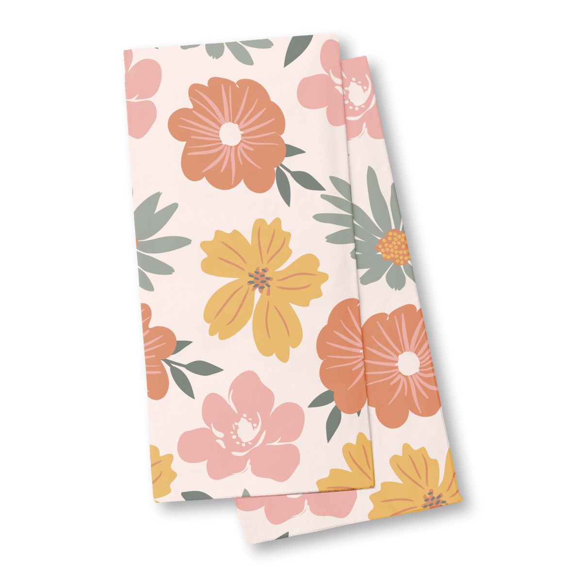 A seamless floral pattern featuring stylized, hand-drawn flowers. The design uses a warm, retro color palette of pink, terracotta, mustard yellow, and sage green on a light cream background, creating a charming and modern look.