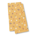 This is a seamless floral pattern featuring small, stylized flowers in white, brown, and rust-orange scattered across a solid mustard-yellow background. Some flowers have tiny green leaves, creating a warm, rustic design.