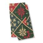 A festive, knitted textile pattern featuring red, green, and dark blue diamonds outlined in gold. Each diamond contains intricate snowflake motifs, evoking the cozy feel of a traditional Christmas sweater or tapestry.