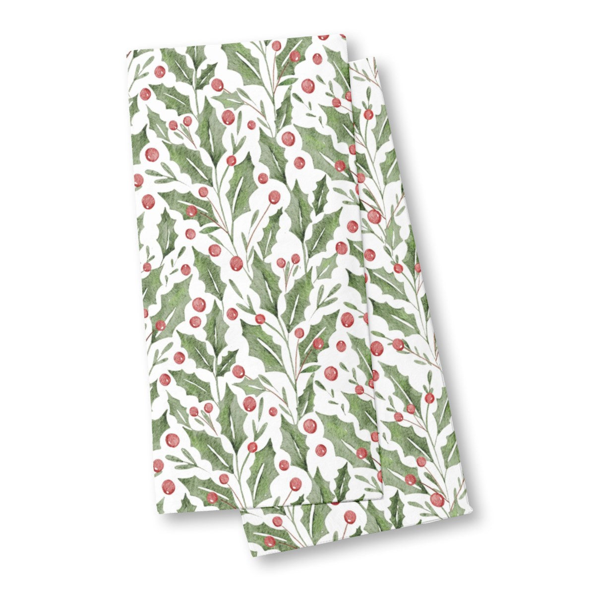 This is a seamless watercolor pattern of festive holly. Spiky green leaves and bright red berries are arranged in vertical sprigs against a white background, creating a classic and cheerful Christmas design.