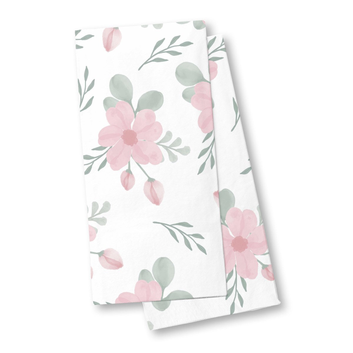 A seamless watercolor pattern featuring delicate pink flowers, buds, and sage green leaves. The gentle floral elements are scattered across a clean white background, creating a soft, elegant, and charming design suitable for textiles or wallpaper.