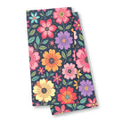 A vibrant, seamless pattern of stylized, colorful flowers in shades of pink, red, orange, and purple. The cheerful blossoms and green leaves pop against a dark navy-blue background, creating a dense and lively folk-art-inspired design.