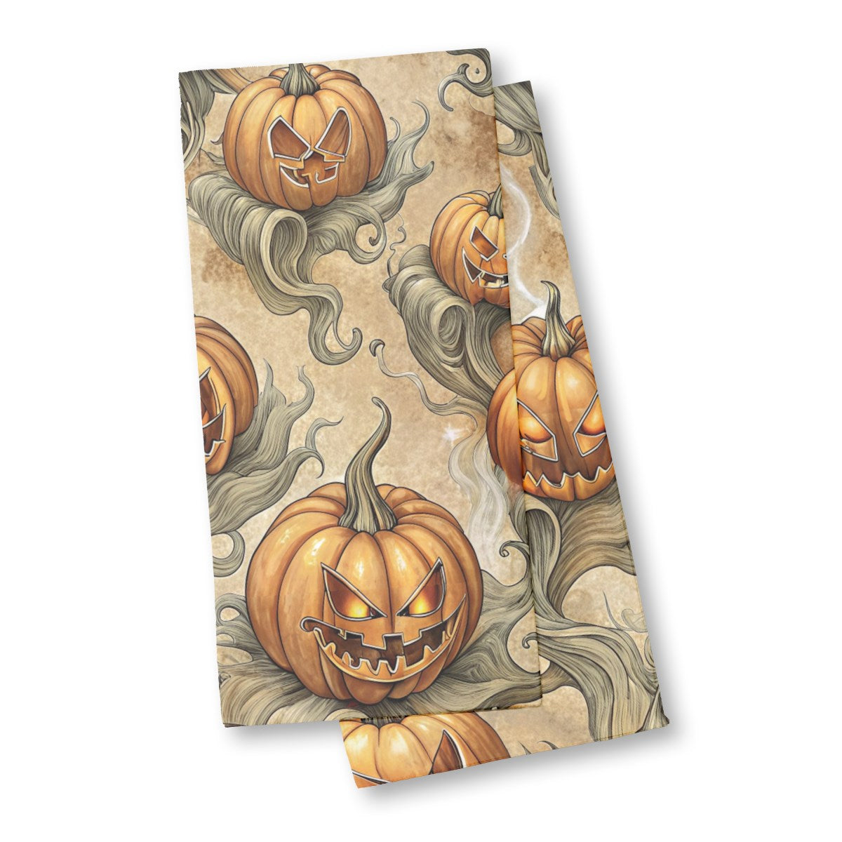 This is a spooky, seamless Halloween pattern of menacing jack-o'-lanterns. Each pumpkin features a unique, glowing, evil face and rests on gnarled, swirling tendrils against a textured, parchment-like background, creating an eerie and festive design.