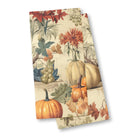 A vintage-style illustration of a bountiful autumn harvest. Orange and pale pumpkins, grapes, and colorful foliage are arranged on tiered stone ledges, creating a rich, decorative pattern with a classic, botanical feel.