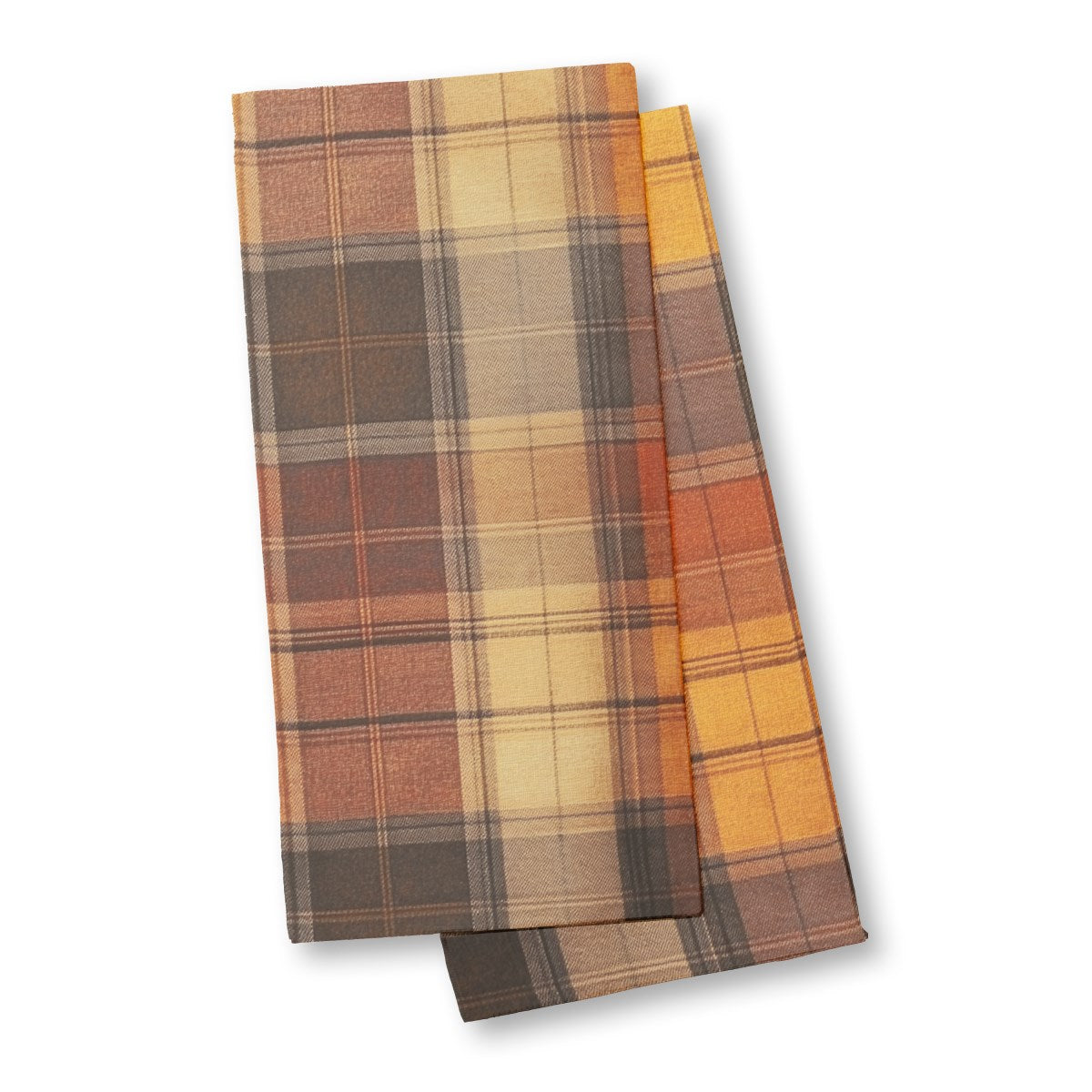 A close-up of a textured plaid fabric in a warm, autumnal color palette. The classic tartan pattern features intersecting stripes of brown, orange, mustard yellow, and beige, creating a cozy and rustic look.
