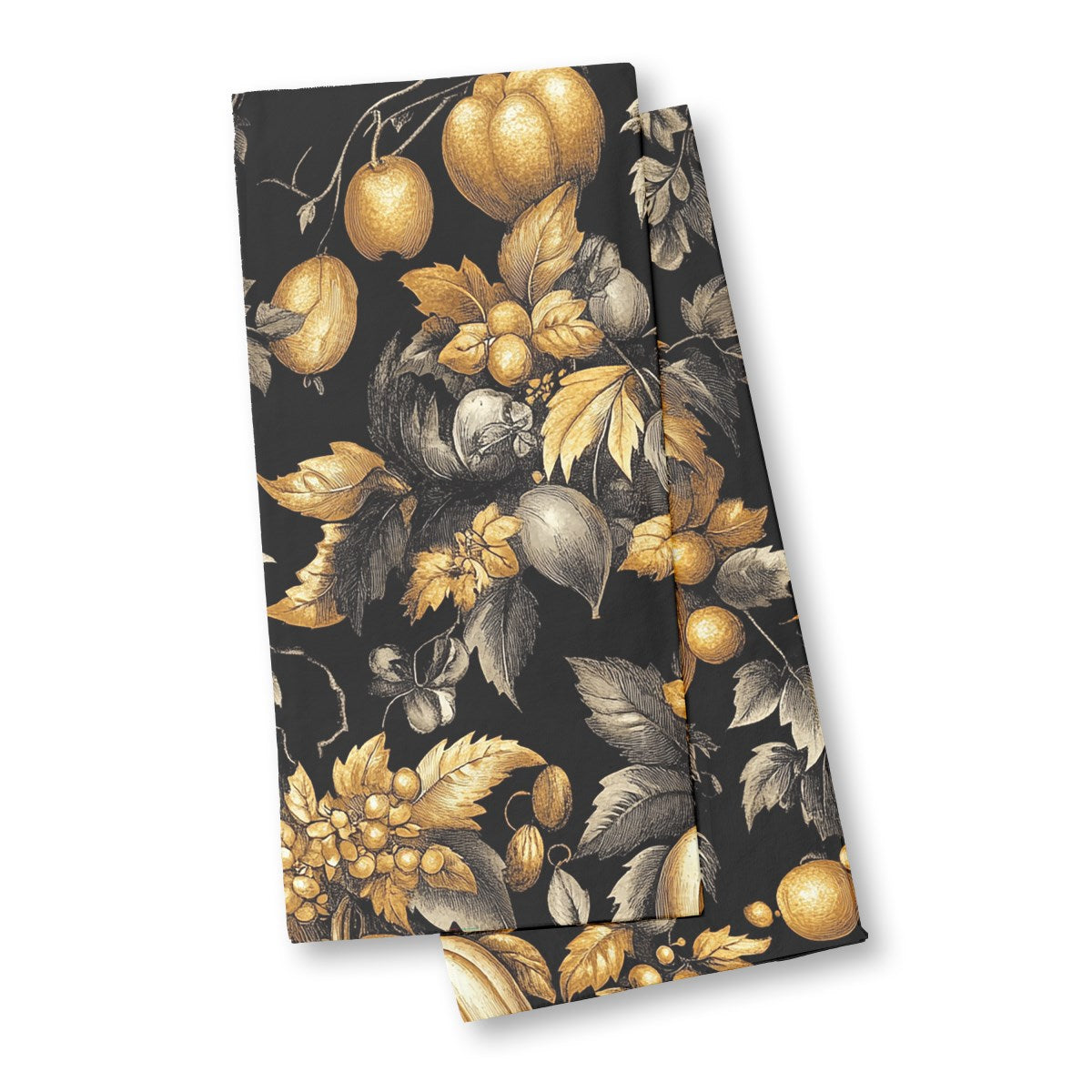 A luxurious, vintage-style pattern of autumnal fruits and foliage. Rendered in a detailed engraving style, golden pumpkins, apples, and grapes contrast richly with silver-toned leaves against a dramatic black background, creating an opulent and seamless design.