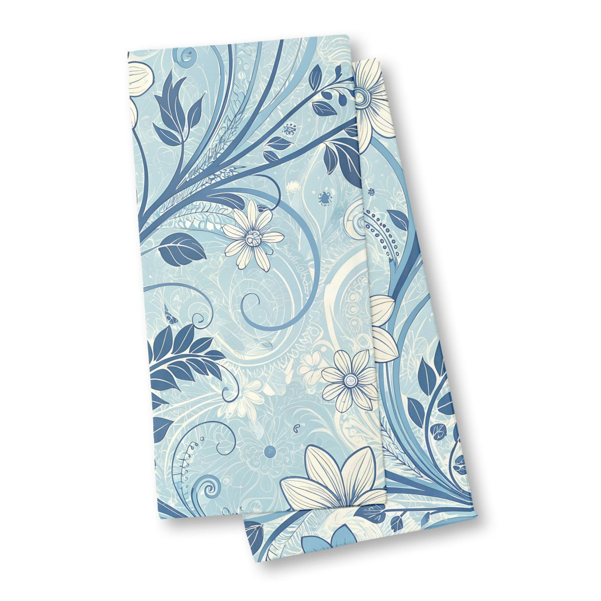 An elegant, seamless pattern of stylized flowers and swirling vines. The intricate design features a classic color palette of blue, navy, and cream against a light blue background, creating a delicate and decorative composition.