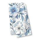This is a delicate and intricate floral pattern featuring blue and white flowers, leaves, and berries. Rendered in a watercolor and ink-line style against a white background, the design creates a timeless and elegant botanical illustration.