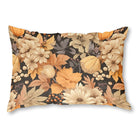 This is a seamless botanical pattern featuring autumn flora. A warm palette of orange, cream, and muted tones for flowers, leaves, and berries is set against a dark background, creating a rich, elegant, and vintage-inspired design with a cozy, autumnal feel.