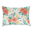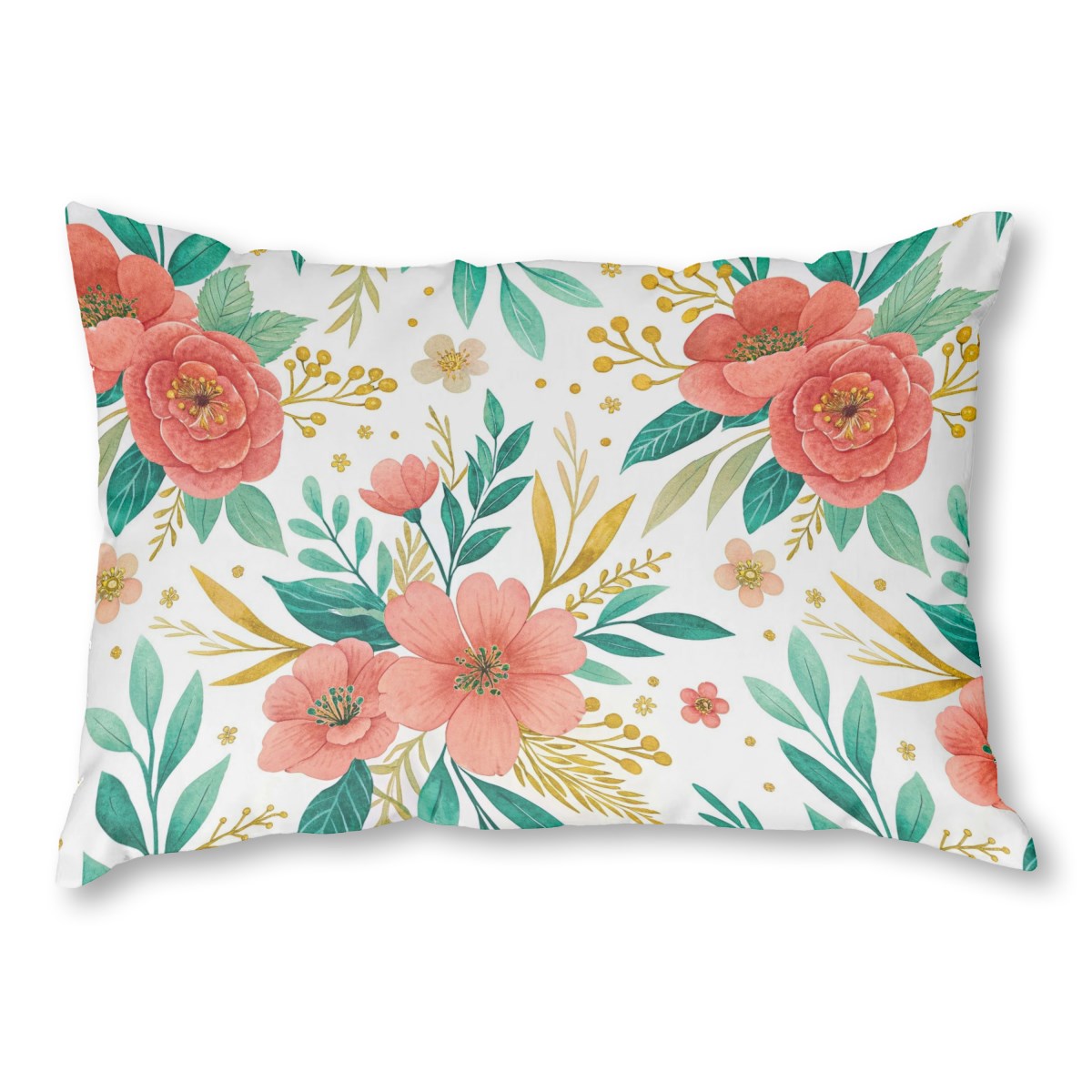 This is a vibrant watercolor floral pattern on a white background. The design features elegant coral-red flowers, teal-green and golden leaves, and delicate gold specks, creating a warm and sophisticated botanical illustration.