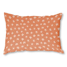 A seamless floral pattern featuring small, simple white flowers with yellow centers. The stylized blossoms are scattered across a warm, terracotta-colored background, creating a charming and minimalist design with a hand-drawn feel.
