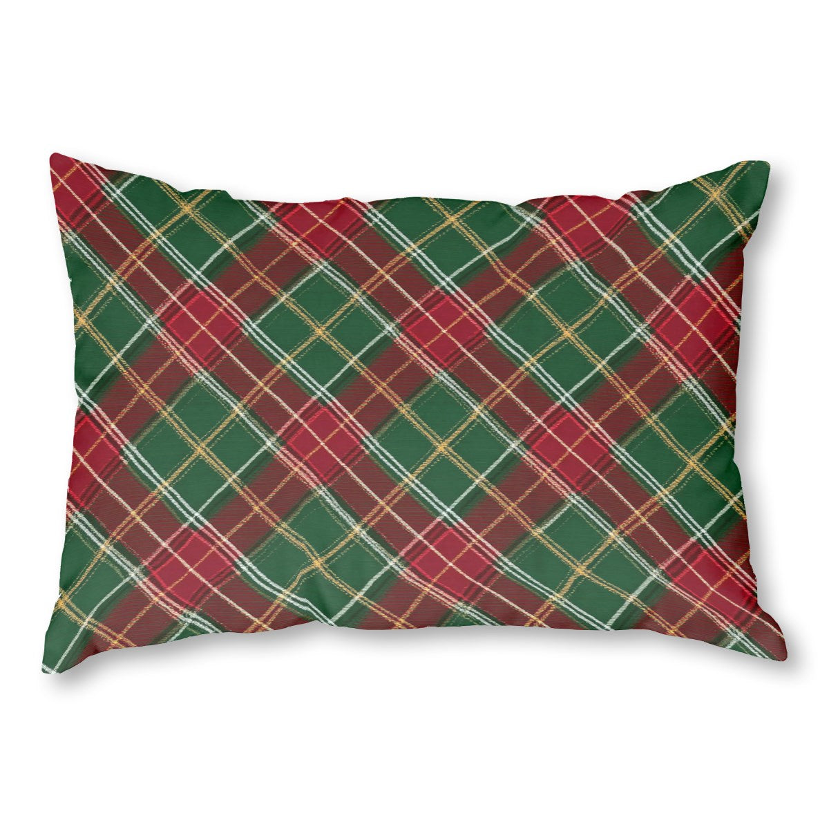 This image features a classic Christmas plaid pattern. The diagonal tartan design consists of intersecting stripes in festive colors of red, green, white, and gold. The pattern has a slightly woven texture, evoking a traditional and cozy holiday feel.
