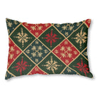 A festive, knitted textile pattern featuring red, green, and dark blue diamonds outlined in gold. Each diamond contains intricate snowflake motifs, evoking the cozy feel of a traditional Christmas sweater or tapestry.