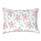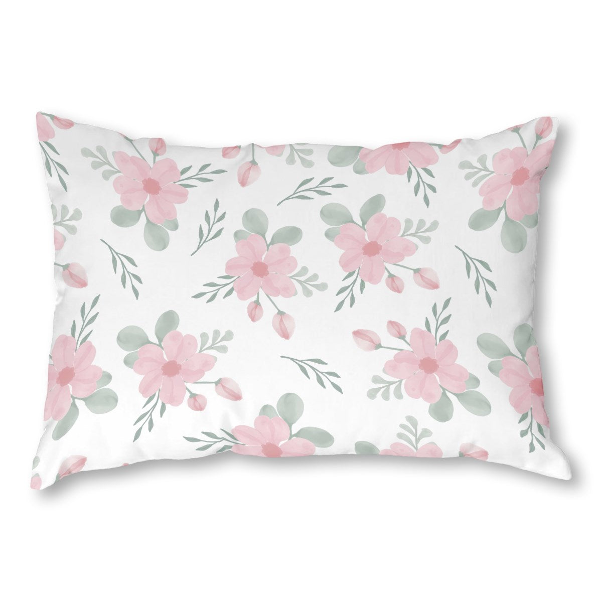 A seamless watercolor pattern featuring delicate pink flowers, buds, and sage green leaves. The gentle floral elements are scattered across a clean white background, creating a soft, elegant, and charming design suitable for textiles or wallpaper.