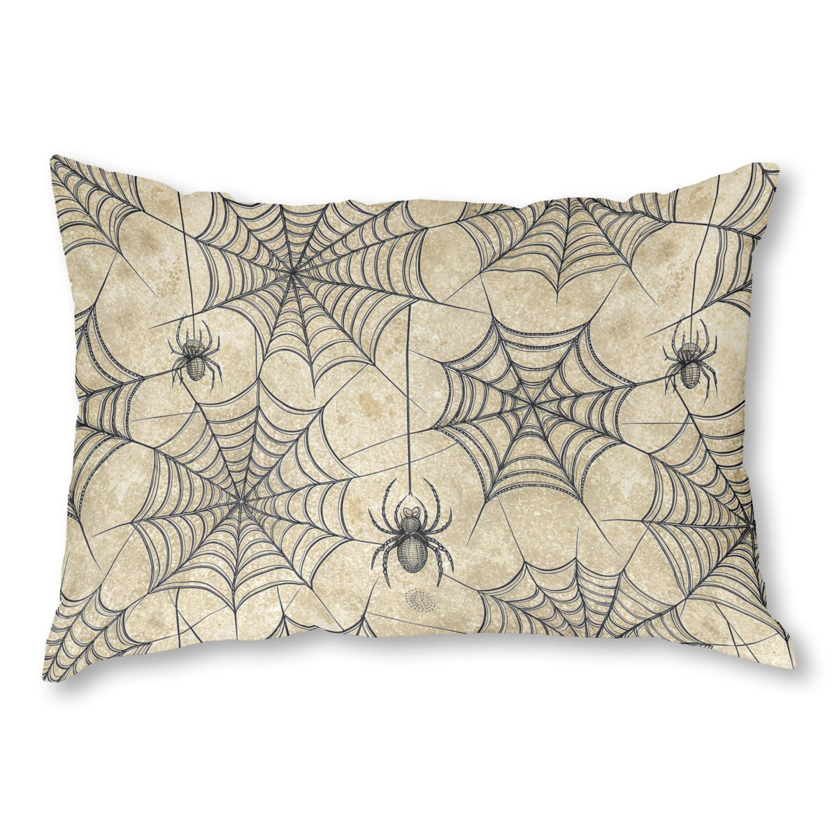 This vintage-style illustration features an intricate, repeating pattern of black spiderwebs on a textured, parchment-like background. Two detailed spiders are present, one crawling on a web and another dangling from a thread, creating a classic spooky or Halloween-themed design.